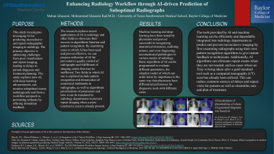 Methods/Materials: The research explores recent applications of AI in radiology and other fields to showcase their success in algorithmic function and pattern recognition. By examining cases in which AI has been used and proven effective, we can purpose utilization of AI for preventative quality control of radiographs and fulfillment of imaging orders that may be inefficient. Two fields in which AI use are explored include pattern recognition and demarcation of anatomical landmarks in radiographs, as well as algorithmic prioritization of parameters and how it can be translated in radiology departments to prevent repeat imaging when a more conclusive exam is already present.