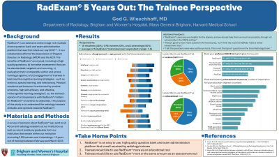 Methods/Materials: A survey of opinions about RadExam® was sent to all 40 current radiology residents at our institution as well as recent residency graduates from our institution that remain within our institution, including 4 R5 trainees and 4 attendings 1-2 years out of training, between February and March 2023.